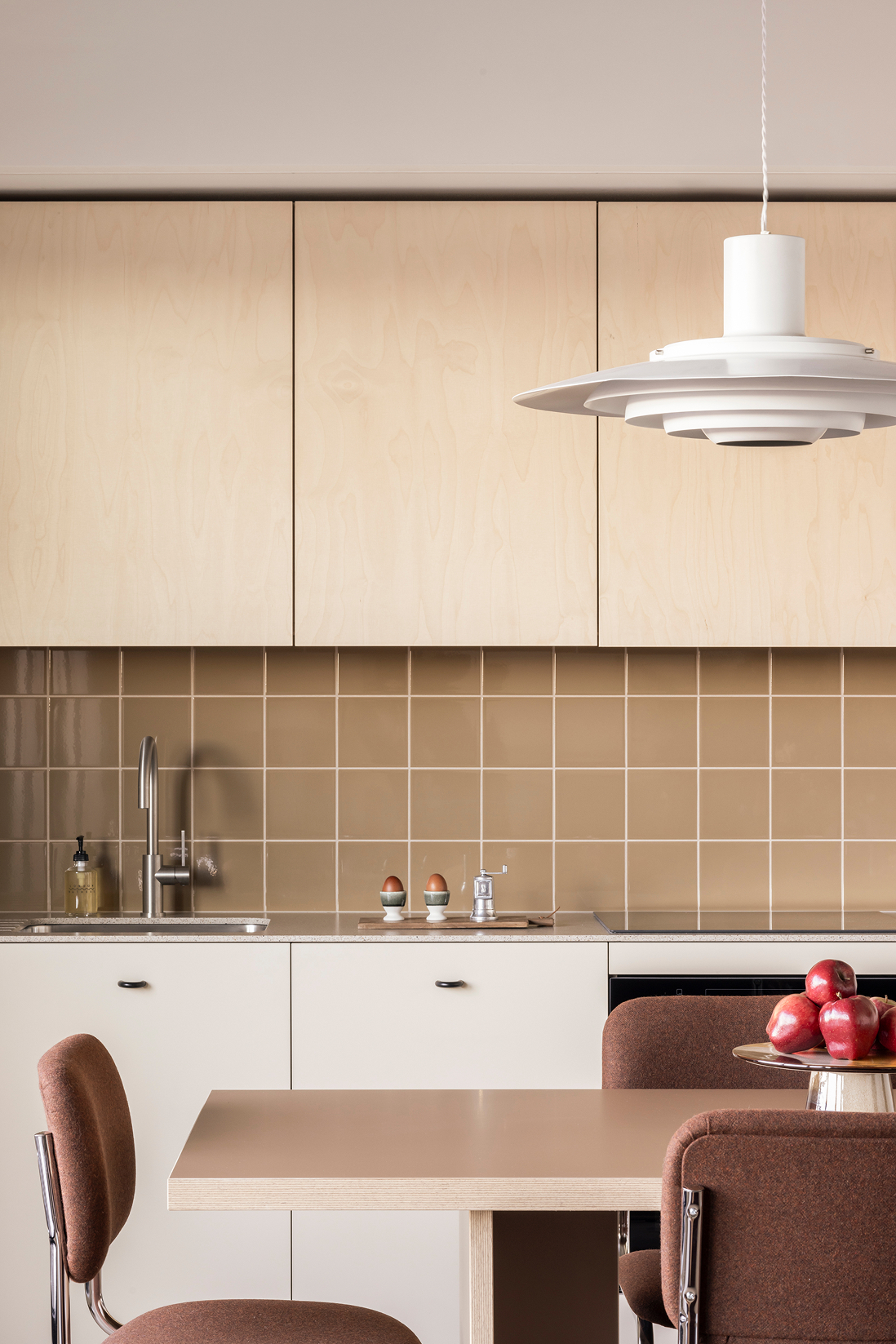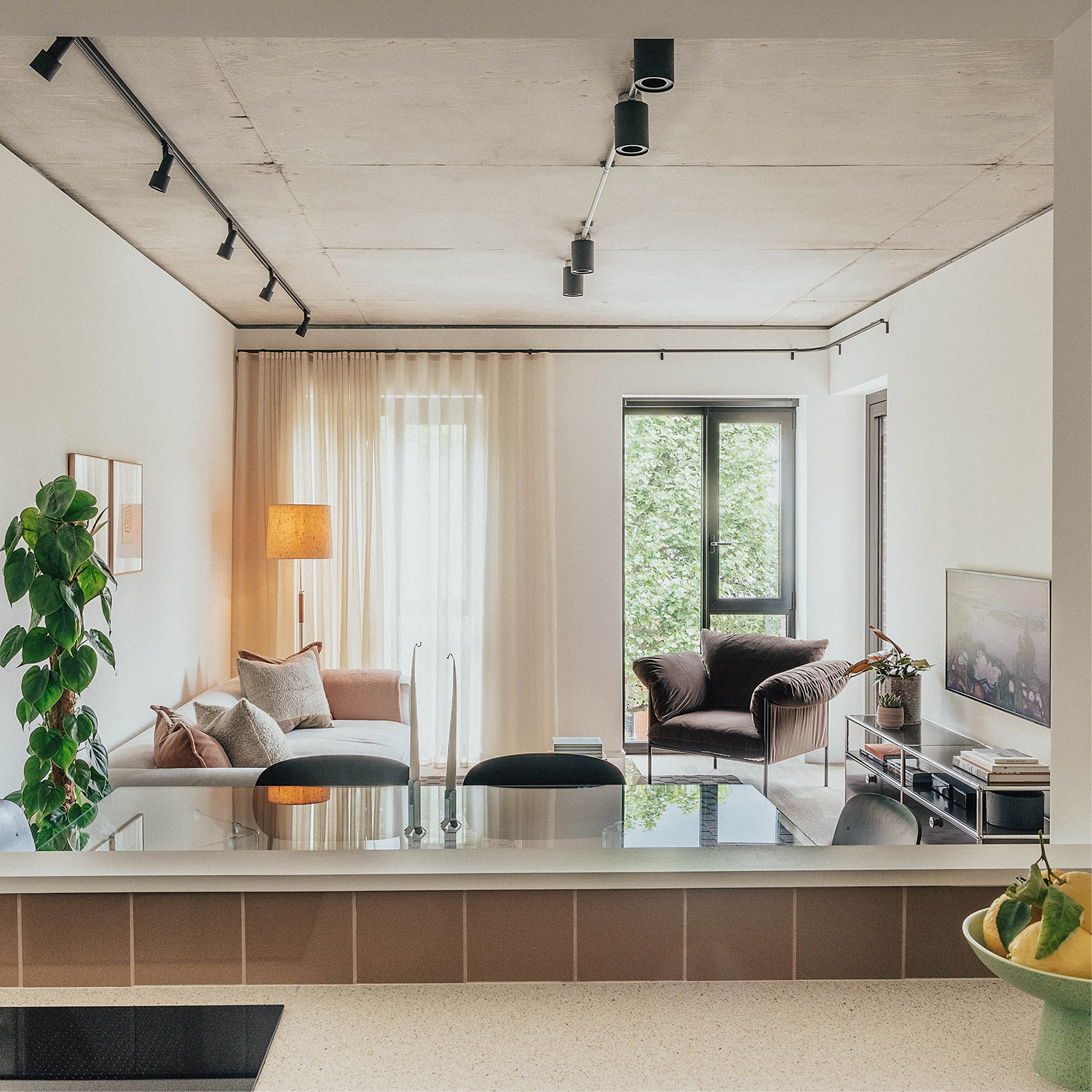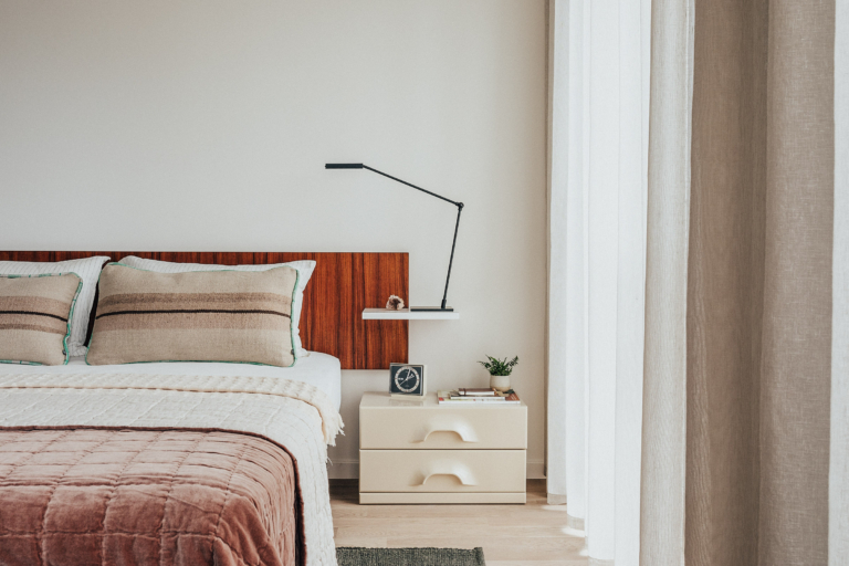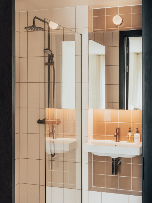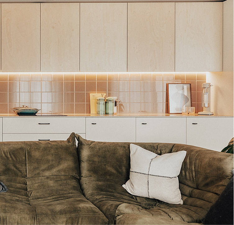 Natural materials run through the comfortable living space, with warm oak flooring bringing a sense of character, juxtaposed by the exposed concrete soffits which nod to the area’s industrial heritage. There is thoughtfully placed storage throughout. In the kitchen, birch-faced plywood and wood-grain cabinetry sit alongside glazed bronze tile splashbacks, referencing the pop of colour introduced at your apartment door.