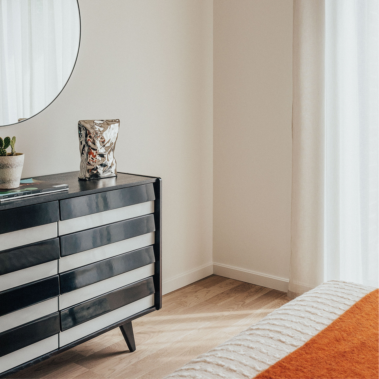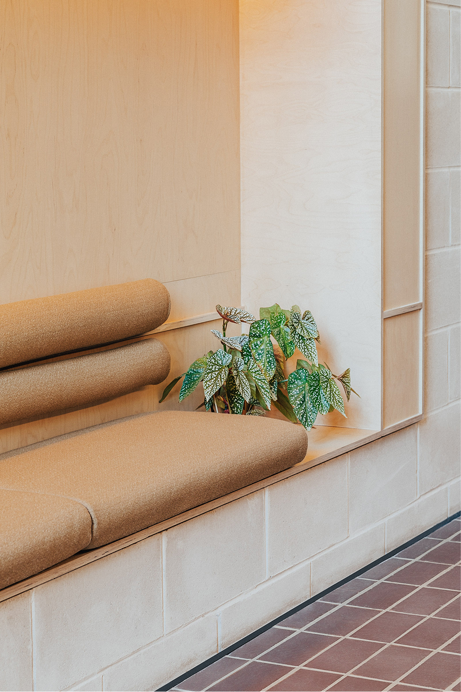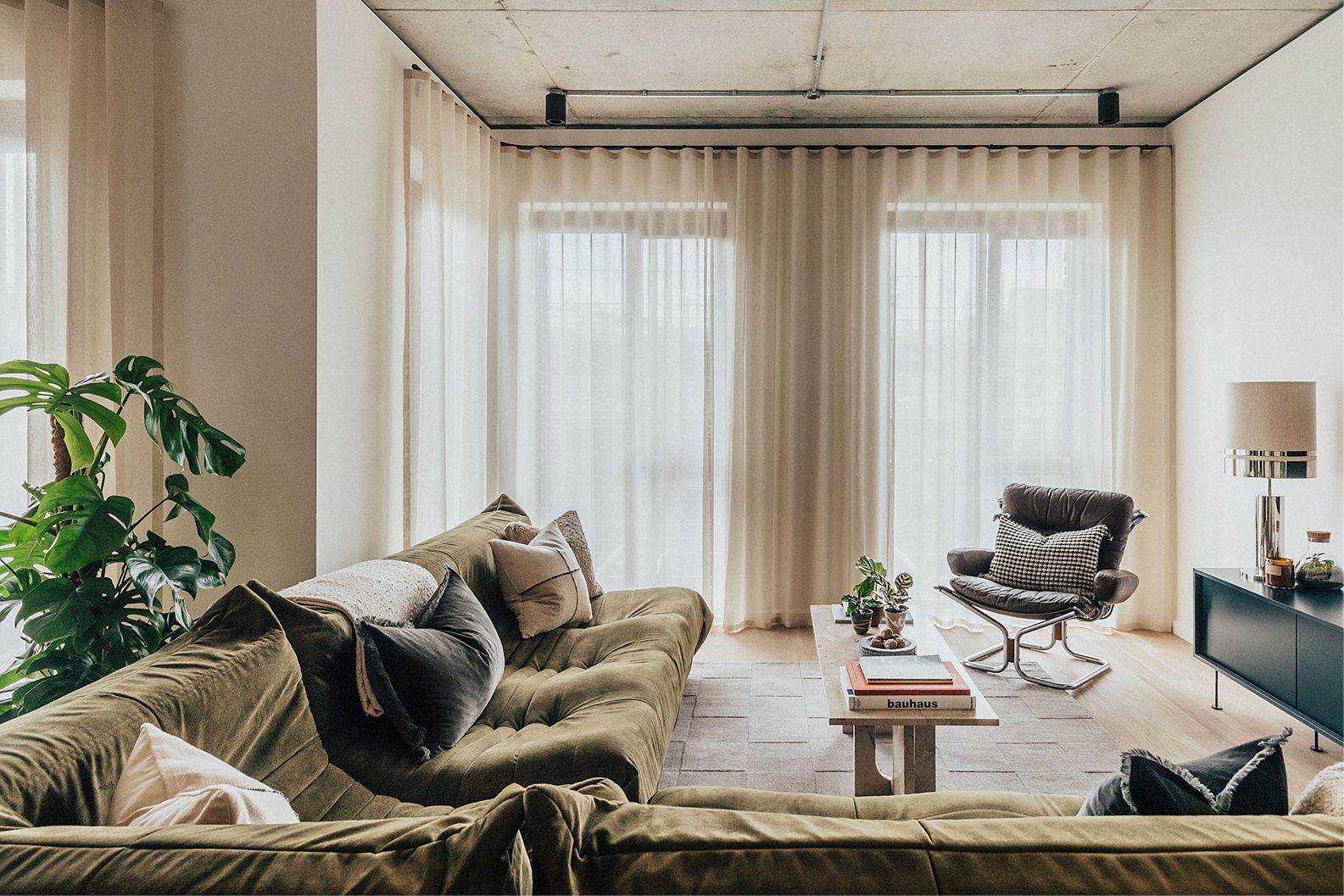 Natural materials run through the comfortable living space, with warm oak flooring bringing a sense of character, juxtaposed by the exposed concrete soffits which nod to the area’s industrial heritage. There is thoughtfully placed storage throughout. In the kitchen, birch-faced plywood and wood-grain cabinetry sit alongside glazed bronze tile splashbacks, referencing the pop of colour introduced at your apartment door.